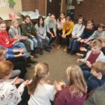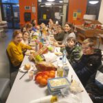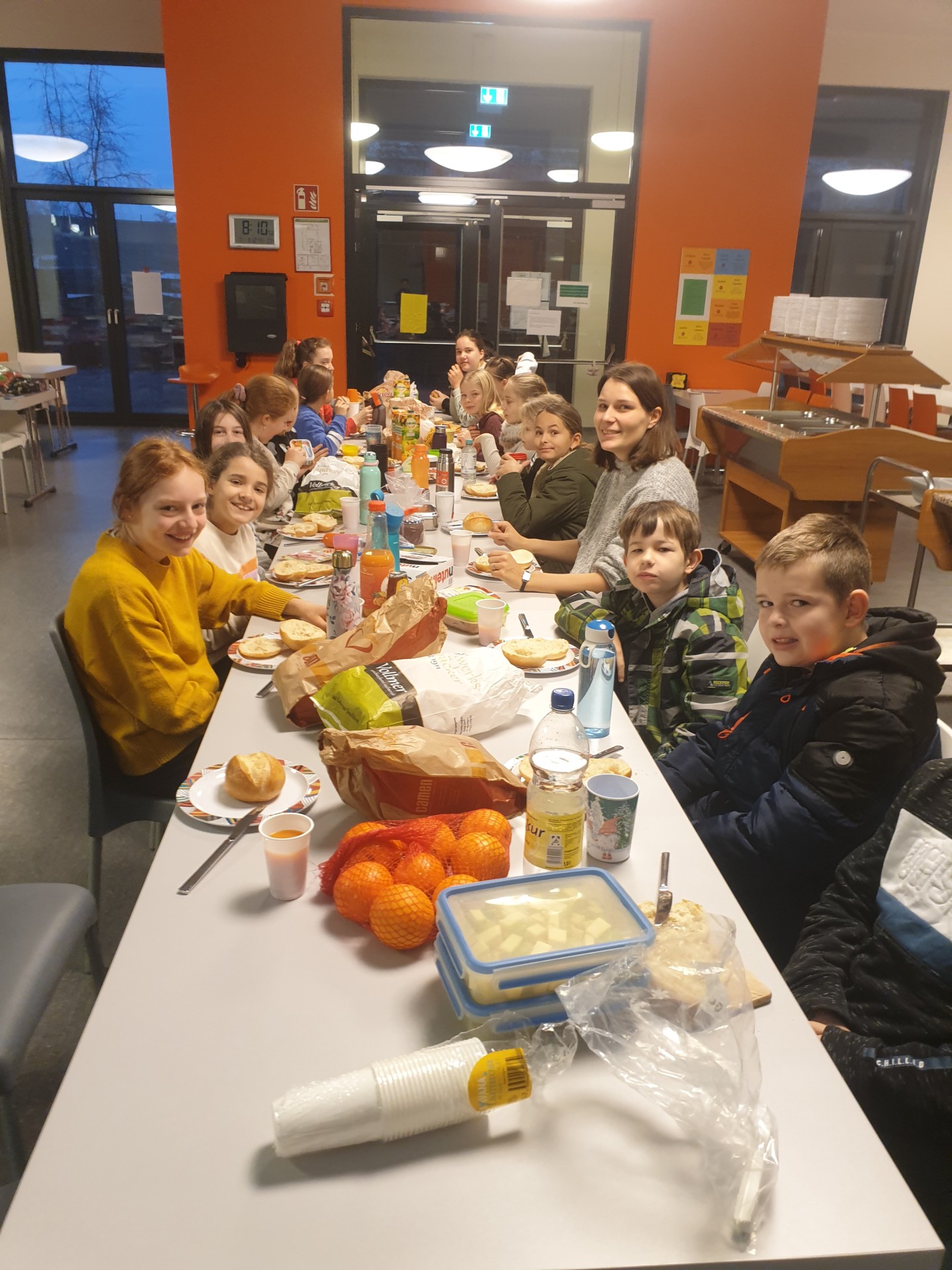 Wir legten unsere Wichtelgeschenke ab und Anastasia, die an diesem Tag einzige gesunde Klassenpatin, las uns das nächste Kapitel unserer Weihnachtsgeschichte vor. Anschließend gingen wir mit unseren mitgebrachten Brötchen, Aufschnitt, Obst und Gemüse in die Mensa, wo wir es uns erst einmal in aller Ruhe schmecken ließen. Einige Eltern und Geschwister von erkrankten Kindern brachten sogar noch Wichtelgeschenke und die zugesagten Leckereien für das Frühstück mit, sodass wir nach einer guten Stunde alle mehr als satt waren.