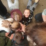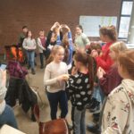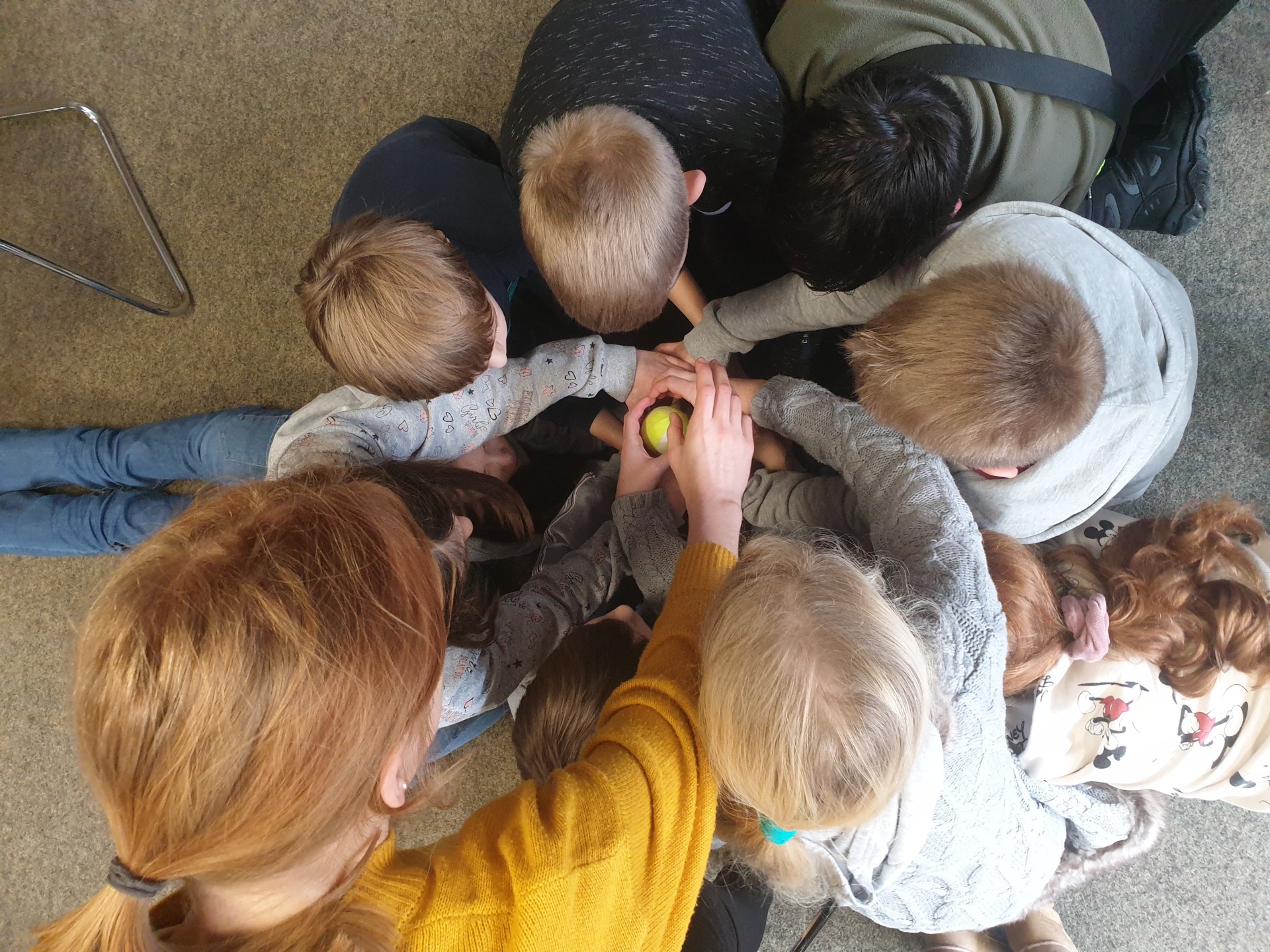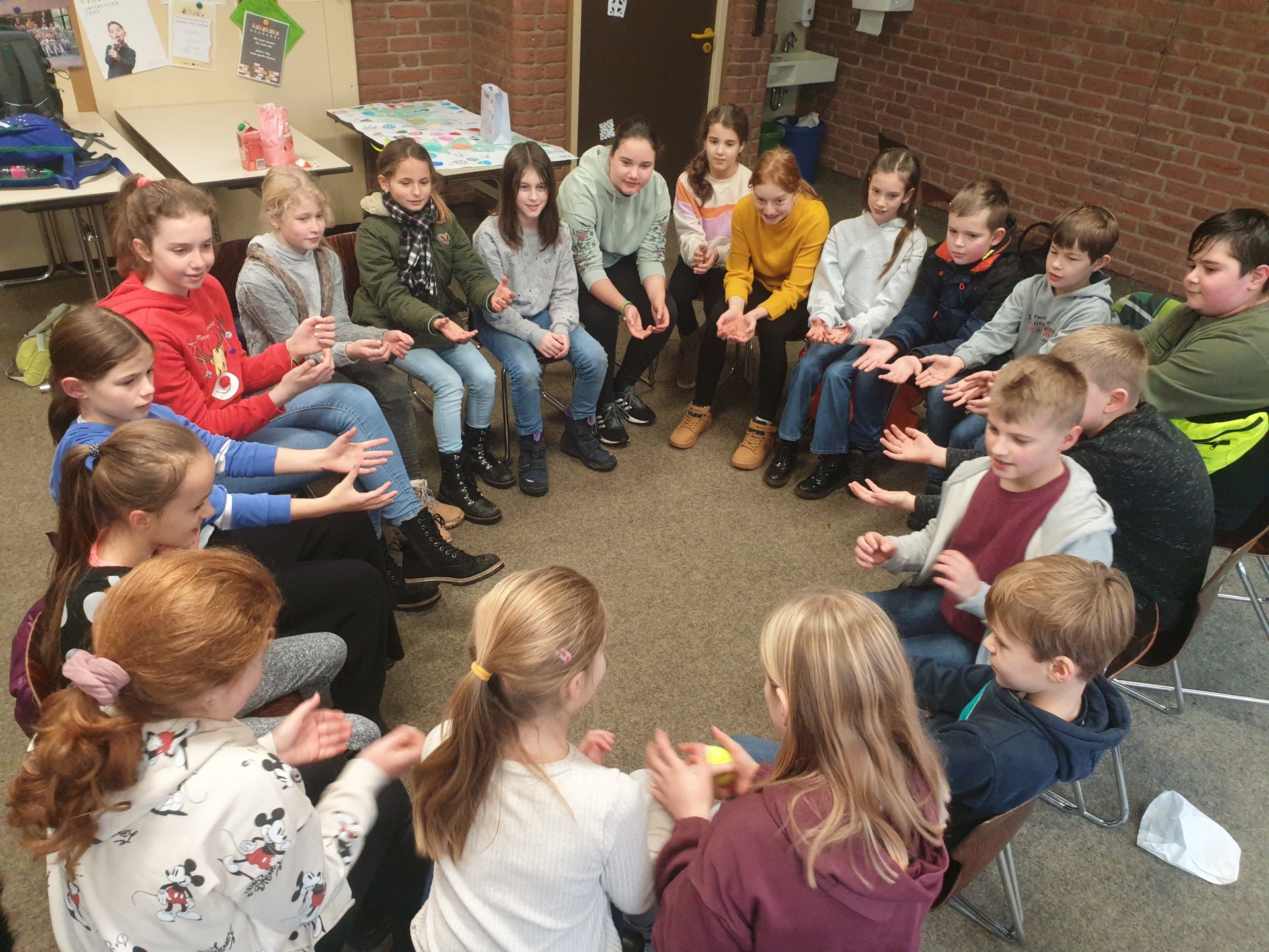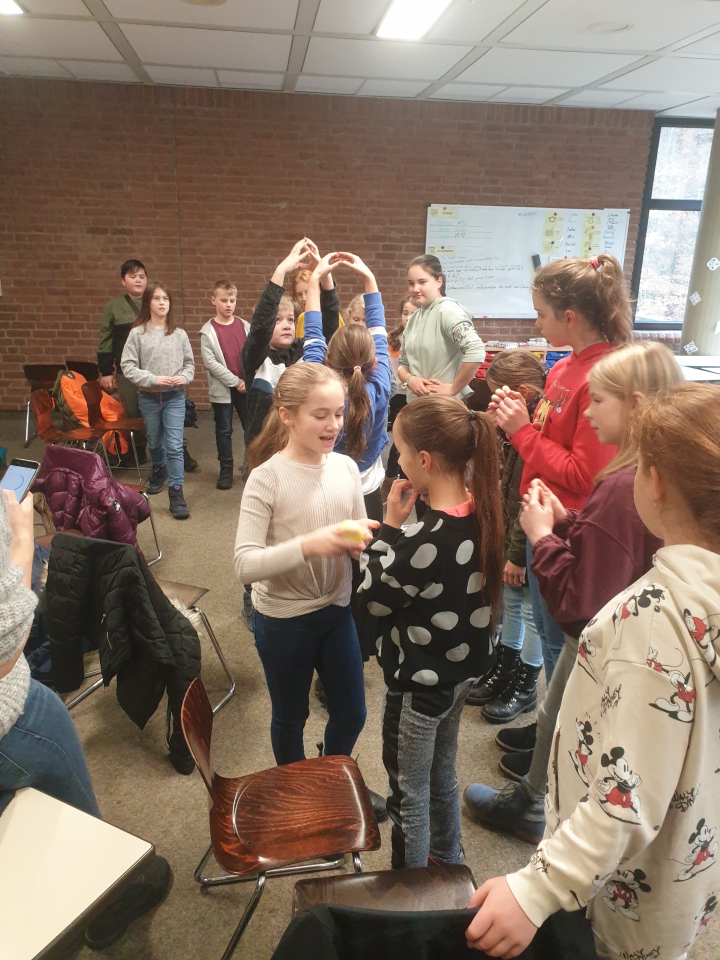 Zur zweiten großen Pause kamen wir wieder in der Schule an. Im Klassenraum wärmten wir uns mit einem Spiel auf, bei dem ein Tennisball durch die Hände von zehn Kindern innerhalb von nur 5 Sekunden gehen musste. Nach ein paar Misserfolgen kamen beide Schülergruppen schließlich auf die richtige Idee, sodass es alle Kinder schafften. Die Lösung verraten wir hier natürlich nicht.