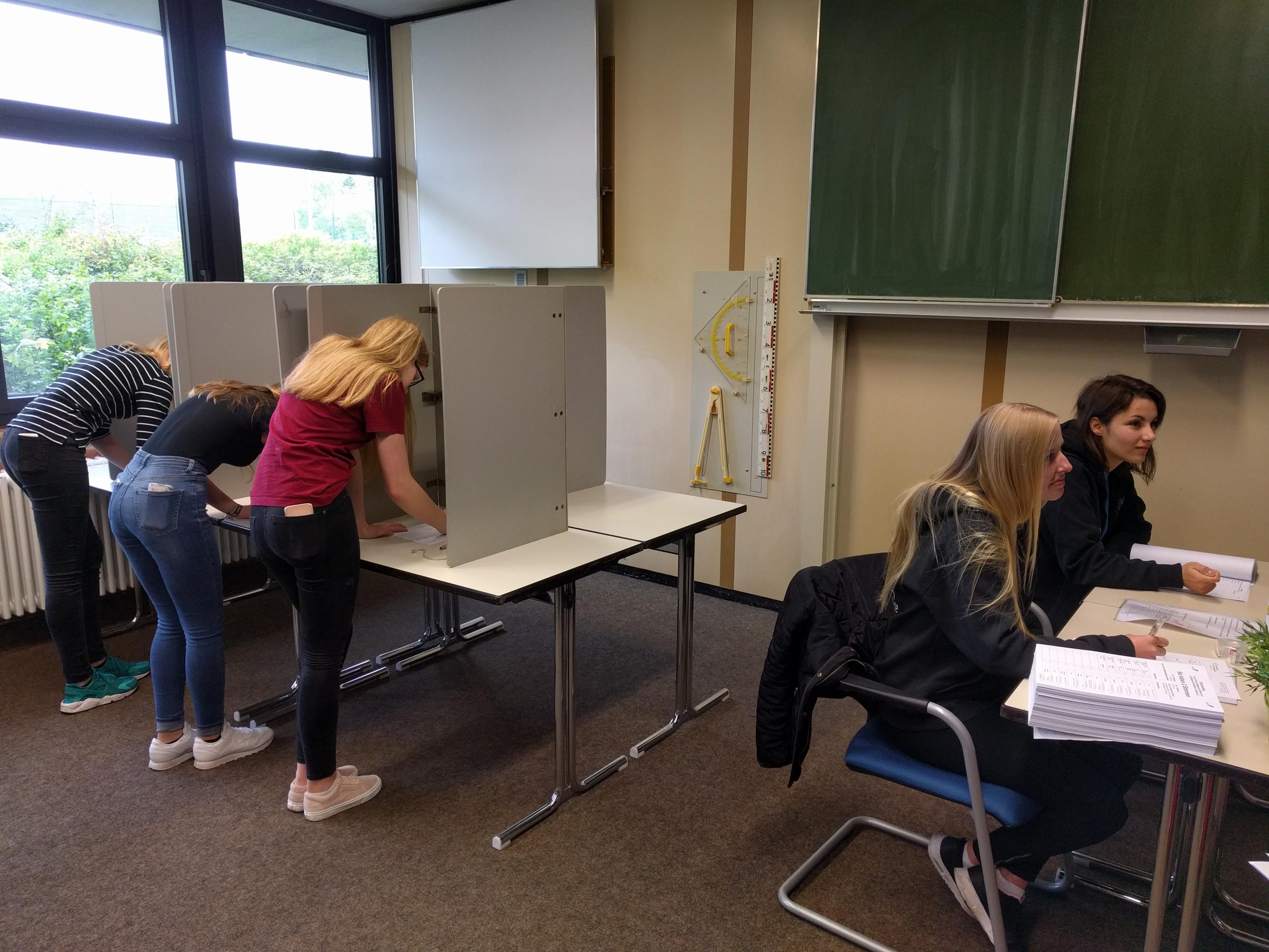Je zwei Stunden sind für die Wahl in einer Jahrgangsstufe vorgesehen. Zwei Stunden, in denen jeweils ca. 100 Schülerinnen und Schüler zum SV-Raum strömen. Erwartungsvoll stehen sie in Teilen in einer Schlange vor der offenen Tür und warten, bis sie an der Reihe sind. Wie bei richtigen Wahlen müssen sie sich zunächst ausweisen und erhalten von den Wahlhelfern ihre Wahlunterlagen. Die Stimmabgabe erfolgt dann natürlich geheim hinter richtigen Wahlkabinen. Für viele eine aufregende Angelegenheit, die die Schülerinnen und Schüler doch sehr ernst nehmen. Ihre erste richtige Wahl!